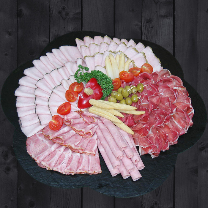 Schinken-Plattemit Pfefferschinken, Haus-Schinken, Presskarree, Saunaschinken, Rohschinken belegt, garniert |